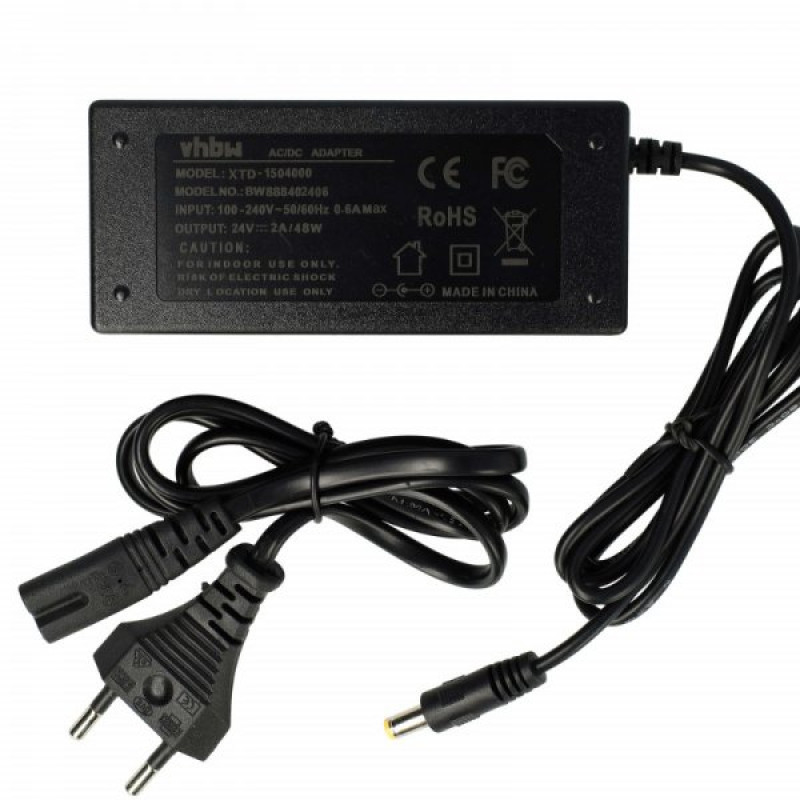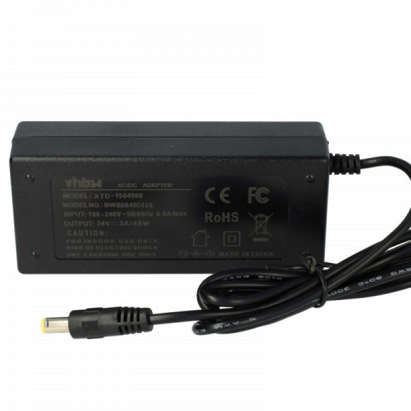 Univerzalni punjač proizvođača VHBW napona 24 V za razne elektroničke uređaje. Punjač ima zaštitu od prekomjernog punjenja, prekostrujnu zaštitu i temperaturnu zaštitu te CE i RoHS certifikate. Dimenzije konektora su 5,5 mm x 2,5 mm. Maksimalna izlazna struja je 2 A. Duljina kabela je 2 m.