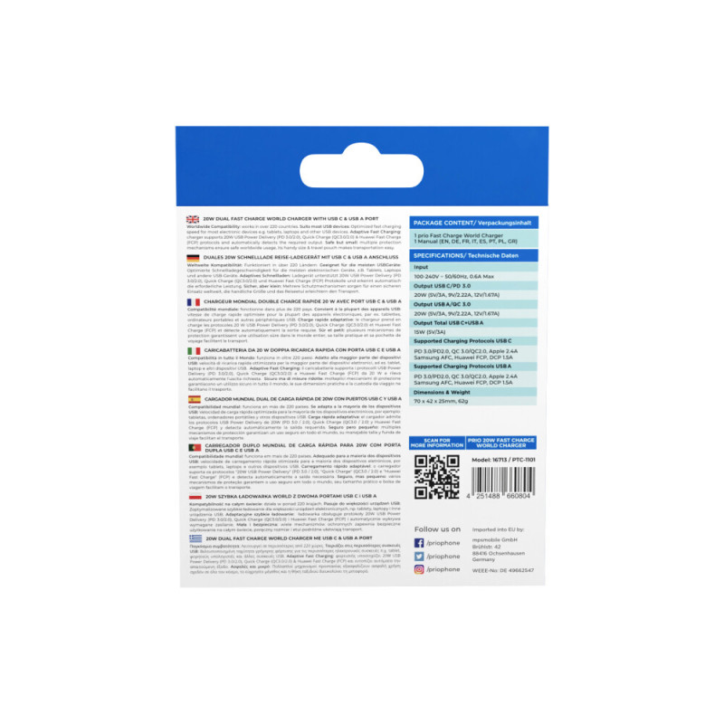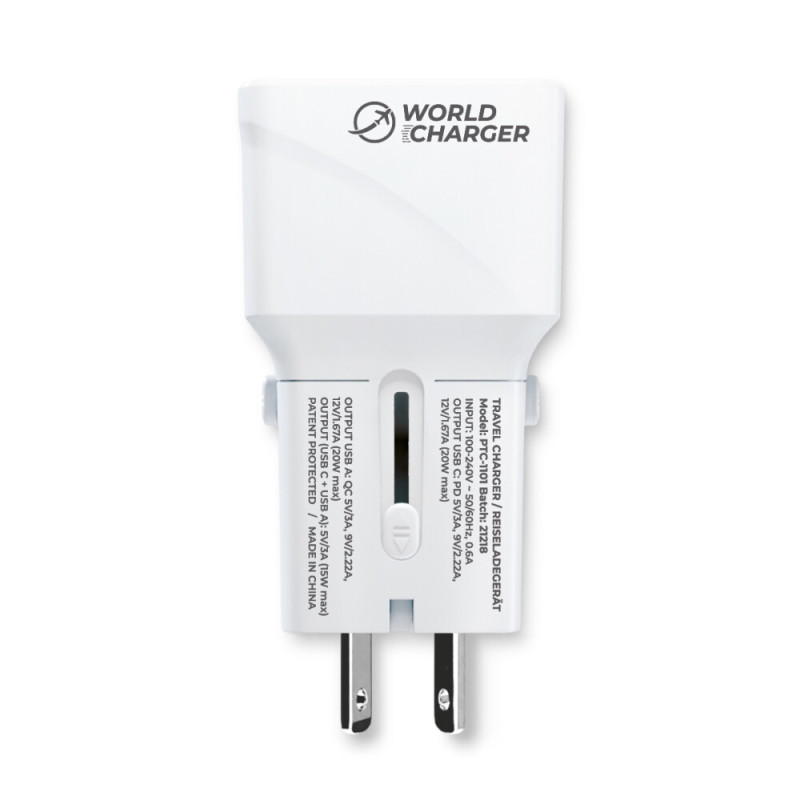 Kvalitetan univerzalni punjač / adapter za međunarodnu upotrebu s četiri vrste mrežnih utičnica: Europa, UK, SAD i Australija/Kina. Pogodan je za punjenje raznih uređaja (fotoaparata, mobitela, tableta i sl.) preko USB-A i USB-C konektora. Punjač se uključuje u standardnu električnu utičnicu. USB kabel nije uključen. Maksimalna izlazna struja je 3 A. Punjač podržava protokole USB Power Delivery (PD 3.0/2.0), Quick Charge (QC3.0/2.0) i Huawei Fast Charge (FCP) te automatski detektira potrebnu izlaznu snagu. Uređaj ima zaštitu od prekomjernog punjenja, prekostrujnu i temperaturnu zaštitu te CE i RoHS certifikate.
